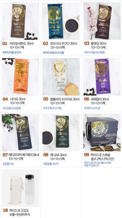 10+10+7 하이드로 더치커피 콜드브루 원두커피 30ml 구매한 것은 "9번"을 제외한 모두 구매하였습니다.