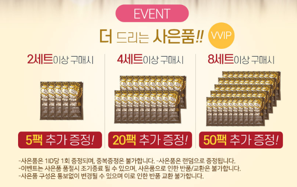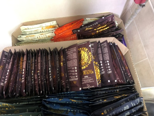 시장에서 물건 담은 것처럼 비닐봉지 하나에 구매한 커피팩을 모두 담겨 있어, 배송 포장상태가 그다지 좋지 않습니다. 행사를 하고 있어 8개 주문 시 50팩 더 주는 이벤트를 진행 중에 있었는데요. (위 이미지는 정리한 것)