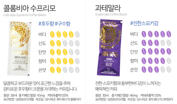 - 각 팩에 유통기간 외 많은 정보를 쉽게 잘 표현되어 있습니다. (카페인 함량 및 먹는 방법 등)