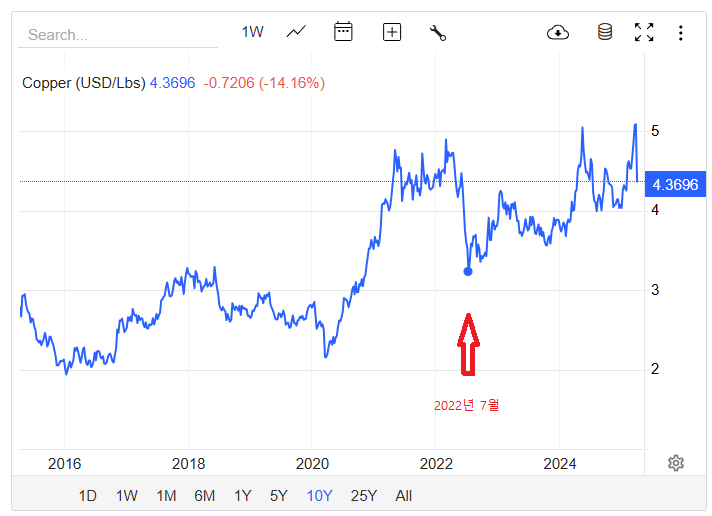 그 변동성이 얼마나 컸냐면 아래 국제 구리 가격을 확인하면 쉬움, 1주일 전 초반 5.2달러까지 올랐다가 1주일 만에 4.36달러까지 10% 떨어짐. 이런 낙폭은 2022년 7월 이후 처음입니다.